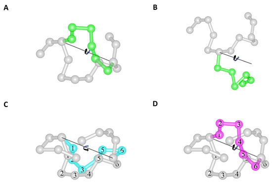 The move set. (A) Crankshaft move: Axis passes through two randomly selected beads and the beads between these are rotated around the axis. (B) Pivot move: Axis passes through one randomly selected bead, and the beads between that and a randomly selected terminus are rotated around the axis. (C) LTyP move variant: The rotated segment can reach the cyan conformation without passing across any fixed segment, hence the linear topology of the chain is preserved. (D) non-LTyP move variant: The magenta conformation can only be reached by the rotated segment by either moving across the front or across the back fixed segments; hence, the linear topology of the chain is not preserved in this crankshaft move.