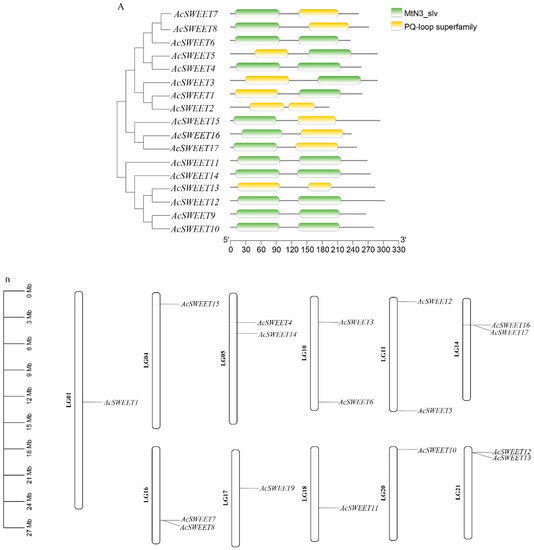 A total of 17 and 21 SWEET proteins in Arabidopsis and rice, respectively, were obtained from the Unirpot database and were blasted in the pineapple genome (https://genomevolution.org/CoGe/NotebookView.pl?nid=937 (accessed on 3 August 2022)). The conserved domain was validated by NCBI-CDD to verify the AcSWEETs. The results showed that all the AcSWEETs contained two MtN3/saliva or PQ-loop superfamily (Figure 1A). A total of 17 AcSWEETs were identified and unevenly distributed on 11 chromosomes (Table 1, Figure 1B). These genes were named on the basis of Arabidopsis homologs. The open reading frame (ORF) lengths of AcSWEETs ranged from 579 bp (AcSWEET2) to 906 bp (AcSWEET12), and their protein length varied from 193 to 302 amino acids. The molecular weights were between 22.29 kDa (AcSWEET2) and 33.36 kDa (AcSWEET12). The theoretical isoelectric point (pI) ranged from 6.53 (AcSWEET12) to 9.75 (AcSWEET5), and most of the pI were more than 8.5 except for AcSWEET2, AcSWEET12 and AcSWEET14. The transmembrane regions of AcSWEET were predicted by TMHMM software. The results showed that 13 members of the encoded protein contained seven transmembranes, and two members harbored six transmembranes, whilst two members only had three transmembranes (Figure S1). Further analysis of putative subcellular localization showed that most of the genes were located in the cell membrane, except AcSWEET5 and AcSWEET13, which were located in the nucleus and chloroplast, respectively. Moreover, AcSWEET15 was located not only in the cell membrane but also in the golgi apparatus (Table 1). These results indicated that AcSWEETs may have a membrane protein function.