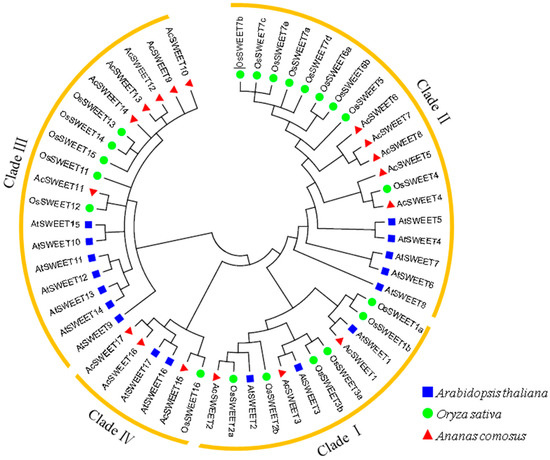 A phylogenetic tree of 17, 17 and 21 SWEETs was constructed using MEGA6 software to study the evolutionary relationships of SWEET proteins amongst pineapple, Arabidopsis and rice, respectively. The phylogenetic tree showed that these genes were classified into four clades (I–IV) (Figure 2 and Figure 3A). Clades II and III in Arabidopsis and rice contained a large number of SWEET family members, with five and six, respectively. In the meantime, clades I and IV had three members. Most SWEETs were grouped into the same branches between rice and pineapple, which implied that the evolutionary relationships of rice and pineapple were close.