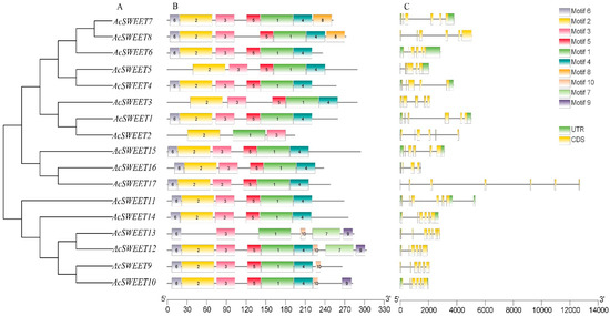 The analysis of intron–exon structures showed that the numbers of intron–exon were highly conserved in AcSWEETs. All AcSWEETs contained several exons, which varied from five to seven. A total of 12 members of AcSWEETs harbored six exons. AcSWEET2, AcSWEET3 and AcSWEET16 contained five exons. AcSWEET3 and AcSWEET17 displayed seven exons. Interestingly, AcSWEET17 had a special structure, with six axons composed of two long introns and four short introns (Figure 3C). A total of 10 motifs were identified in AcSWEETs using MEME. Three to nine motifs were detected in AcSWEETs. AcSWEET2 had the shortest and least amino acid sequence with three motifs. By contrast, AcSWEET13 had the longest sequence, with nine motifs. Motif1 and motif3 were observed in all AcSWEETs. Motif2, motif4 and motif5 were present in all AcSWEETs except AcSWEET2 and AcSWEET13. Motif10 was the specific motif in AcSWEET9, AcSWEET10, AcSWEET12 and AcSWEET13, which were classified in the same clade (Figure 3B).
