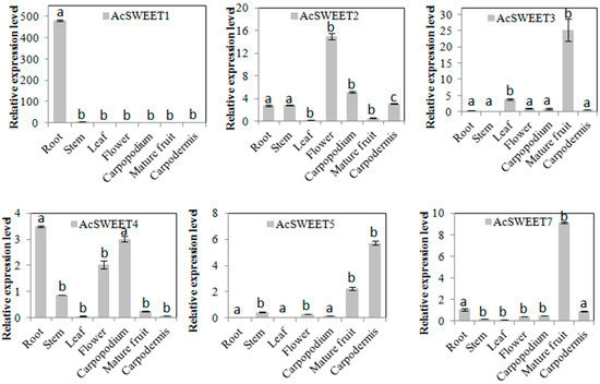Tissue-specific expression profiles of AcSWEETs in pineapple. Values represented as mean of three biological replicates, and standard deviation bars represented as means ± SD (n = 3). Different letters indicate significant differences at p < 0.05.