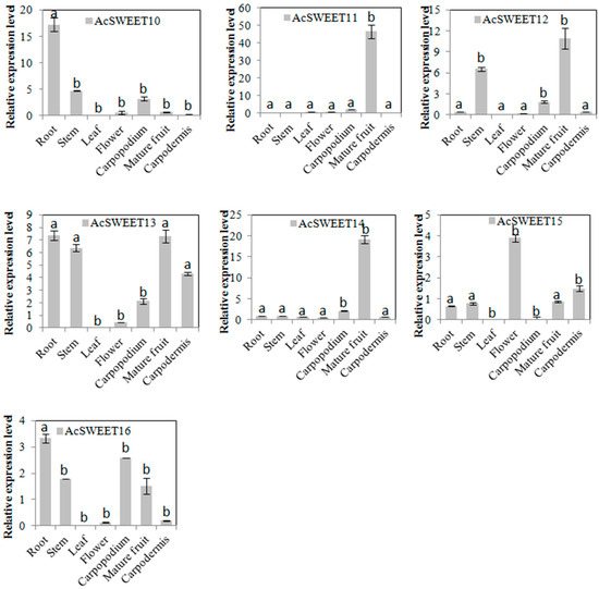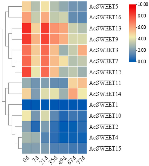 The expression levels of AcSWEETs were analyzed in root, stem, leaf, flower, carpopodium, mature fruit and carpodermis by qRT-PCR to understand the potential functions of these genes (Figure 4). These results indicated that AcSWEET1, AcSWEET10 and AcSWEET13 were highly expressed in root. AcSWEET4 and AcSWEET16 were highly expressed not only in root but also in carpopodium. The expression levels of AcSWEET2 and AcSWEET15 were higher in flower than in other tissues. AcSWEET3, AcSWEET7, AcSWEET11, AcSWEET12 and AcSWEET14 were strongly expressed in fruit. AcSWEET5 was predominantly expressed in the carpodermis. Interestingly, all AcSWEETs had lower expression in leaf and stem. These results indicated that AcSWEETs may be involved in the unloading of pineapple.