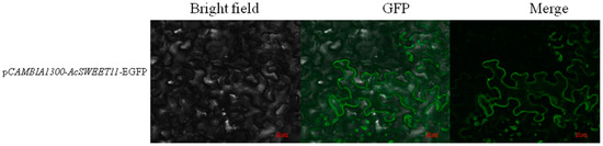 The coding sequence of AcSWEET11 was fused with EGFP driven by 35S promoter to explore the subcellular localization of the AcSWEET11, and the gene was transiently expressed in the cells of Nicotiana benthamiana. The transient expression of AcSWEET11 showed that the GFP fluorescence was specifically observed in the cell membrane (Figure 6). This result indicated that the function of AcSWEET11 was predominantly at the membrane of plant cells.