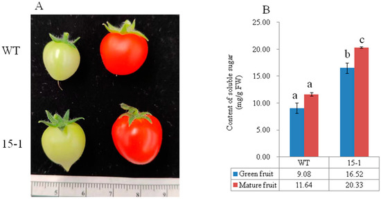 Overexpression of AcSWEET11 improved soluble sugar in micro-tom tomato. (A) Development of tomato fruit in WT and transgenic tomato lines (15-1). (B) Soluble sugar content of WT and transgenic tomato lines (15-1). Blue columns presented in green fruit, red columns presented in mature fruit. Values denoted three biological replicates, and vertical lines represented as mean of SD. Different letters denoted significant difference with one-way ANOVA test by Tukey’s test (p < 0.05).