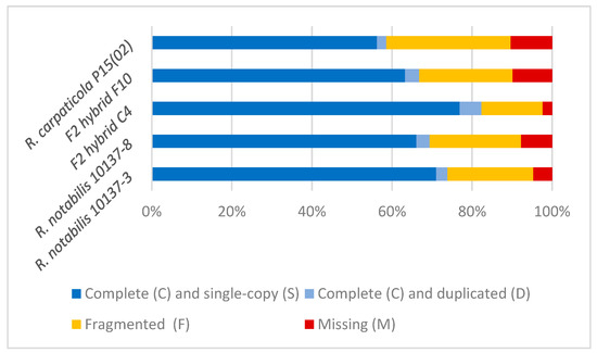For all of the investigated samples, the majority of the 425 BUSCOS included in the Viridiplantae dataset were found to be present and single-copy (Figure 1). The F2 hybrid C4 shows the highest number of recovered BUSCOs and the lowest number of missing ones, while R. carpaticola P15(02) shows the lowest number of recovered BUSCOs and the highest number of missing ones. However, overall the results of BUSCO are very comparable amongst the five samples and illustrate that a substantial number of known single-copy benchmark genes could be recovered in the samples.