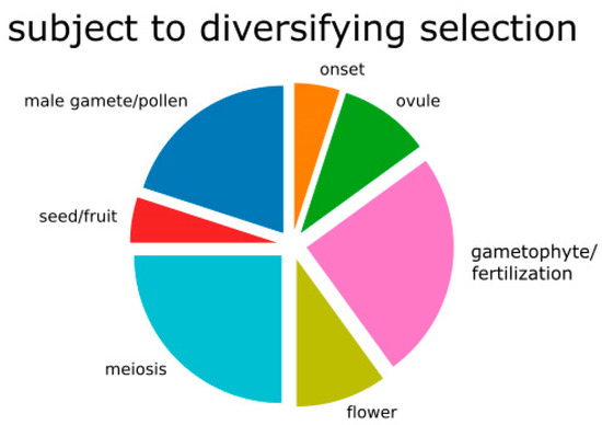 In addition, we collected GO terms linked to reproduction, specifically GO:0048229: gametophyte development, GO:0000003: reproduction, GO:0022414: reproductive process, GO:1903046: meiotic cell cycle process, GO:0048236: plant-type sporogenesis, and GO:0000741: karyogamy, including all their respective child terms, and investigated whether these were present in the sets of genes under selection. We assigned the subset of GO terms related to reproduction into five stage-specific categories: (1) flower and ovule formation, (2) meiosis, (3) embryo sac development and gametogenesis, (4) embryo and seed formation, and (5) male functions (pooled over stages).