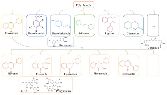 The focus of AD treatment strategies is also gradually shifting to alternative therapies. A diet-based lifestyle is the most effective that can be easily adopted by individuals among these alternative therapies [26,27]. Improving the dietary structure, such as choosing a Mediterranean or Asian diet rich in fruits and vegetables, is recognized globally as an effective means to prevent the development of AD [28,29,30]. Polyphenols are commonly found in vegetables, fruits, and cereals such as grapes, blueberries, and apples, in addition to tea and red wine [31,32,33,34,35]. Polyphenols have diverse and complex structures. Most polyphenols are found in glycosidic forms in plants [36]. Polyphenols are mainly classified into flavonoids and nonflavonoids based on the basic flavonoid structure, aglycone. Flavonoids include flavones, flavonols, flavanones, flavanonols, and isoflavones, whereas nonflavonoids are mainly classified into phenolic acids, phenolic alcohols, stilbenes, lignans, curcumins, and coumarins [37] (Figure 1). Polyphenols have been widely used for the treatment of age-related neurological disorders, including AD and cognitive disorders, due to their antioxidant and anti-inflammatory activities [38]. Many in vivo and in vitro experiments have confirmed the therapeutic effect of polyphenols on neurodegenerative diseases, including AD. These experiments also clarified several AD-related molecular mechanisms and led to the development of several hypotheses regarding the development of AD, such as oxidative stress, cholinergic, Aβ toxicity, tau protein, and neuroinflammation hypothesis [39,40,41,42].