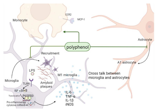In conclusion, polyphenols inhibit the transformation of microglia and astrocytes to a pro-inflammatory phenotype and reactive astrocytes, respectively. Polyphenols further hinder the secretion of classical inflammatory factors such as TNF-α, IL-1β, and IL-6 by regulating the NF-κB pathway to improve inflammatory cross-talk in the brain and affecting monocyte/macrophage system to alleviate the symptoms of AD (Figure 3).