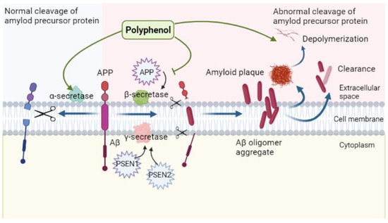 Regulatory role of polyphenols in the context of amyloid neurotoxicity: polyphenols allow cleavage of Aβ correctly by promoting the activity of α-secretase, inhibit the activities of β-, and γ-secretases, prevent erroneous cleavage, promote Aβ plaque depolymerization and clearance, and reduces its neurotoxicity.