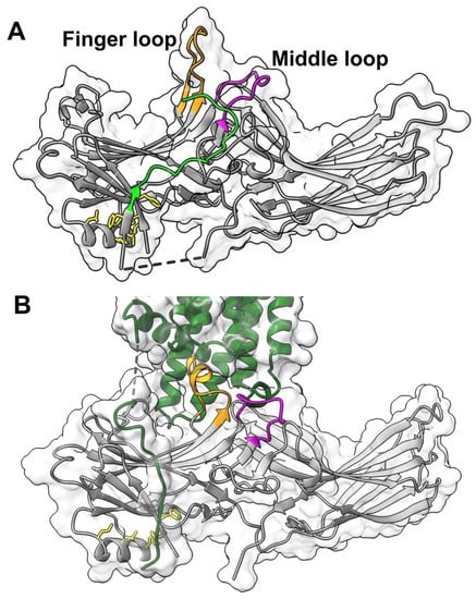 The position of the middle loop in free and rhodopsin-bound arrestin-1. (A) Arrestin-1 (molecule A in the crystal tetramer of bovine arrestin-1, PDB ID: 1cf1 []) with finger loop (residues 68–81) shown in orange and middle loop (residues 132–142) in magenta. Attached arrestin-1 C-terminus is shown in bright green. (B) The structure of the mouse arrestin-1 complex with rhodopsin (complex A, PDB ID: 5w0p []). Arrestin-1 (gray) in all panels and rhodopsin (dark green) in panel (B) are shown as flat ribbons with molecular surfaces indicated. The direction (N-to-C) of β-strands is shown by arrows. Side chains of bulky hydrophobic residues mediating the three-element interaction [] are shown as yellow stick models. Images were created in DS ViewerPro 6.0 (Dassault Systèmes, San Diego, CA, USA).