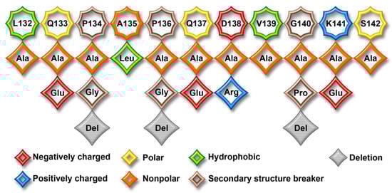 The middle loop demonstrates the largest detected movement upon arrestin-1 [] and arrestin-2 and -3 [] binding to rhodopsin (Figure 1). It is also found in contact with the receptor in the structures of rhodopsin-bound arrestin-1 [,] (Figure 1) and receptor-bound arrestin-2 [,,,,,]. Thus, in addition to enhancing selectivity, the middle loop appears to directly contribute to the arrestin binding to the receptor. This loop is 11 residues long (Leu132 to Ser142 in bovine arrestin-1, Figure 2 and Figure 7). It is identical in bovine and mouse arrestin-1, and only one residue in it differs in the human protein []. It is also highly conserved in non-visual arrestin subtypes (Figure 7B). This loop contains hydrophobic and hydrophilic residues, including charged ones, as well as three residues that usually break secondary structure, Pro134, Pro136, and Gly140. To probe their role in rhodopsin binding, we substituted every residue with alanine, added a charge without affecting geometry (Gln- > Glu), introduced charge reversals (Asp- > Arg, Lys- > Glu), deleted Pro134 and Gly140, replaced these residues with Ala, as well as changed Pro into Gly and vice versa (Figure 2).