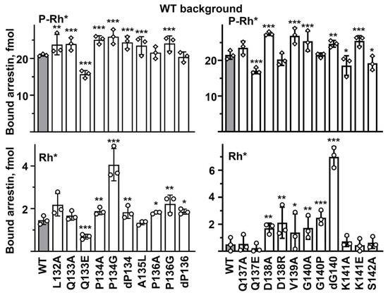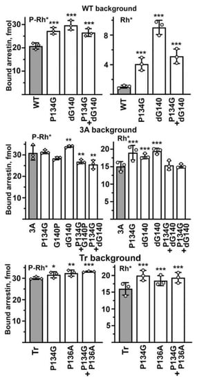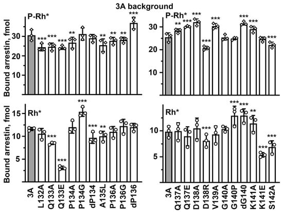 The 3A mutant of arrestin-1 is also enhanced, demonstrating much greater binding to Rh* than WT []. In fact, a homologous 3A version of mouse arrestin-1 was shown in vivo to partially compensate for the lack of rhodopsin phosphorylation [,]. The 3A mutation acts via a mechanism that is similar but not identical to that operating in the Tr mutant. The C-tail, which is deleted in the Tr mutant, is present but detached from the N-domain in the 3A: the 3A mutation destabilizes its interactions with β-strand I and α-helix [], mimicking the release of the C-tail observed upon rhodopsin binding [,,]. The binding of mutants on the 3A background to both P-Rh* and Rh* was tested (Figure 5). As could be expected, the overall score was similar to that on the Tr background: seven mutations increased the binding to P-Rh*, while nine reduced it (Figure 5). However, the pattern of the effects on the 3A background was not identical to the pattern on the Tr background (compare Figure 4 and Figure 5). Q133E decreased the binding to P-Rh* on the 3A and WT backgrounds, but did not significantly affect it on the Tr background (Figure 3, Figure 4 and Figure 5). However, this mutation significantly reduced Rh* binding (by 50–80%) on all three backgrounds tested (Figure 3, Figure 4 and Figure 5). ΔP136 increased the P-Rh*, but not Rh*, binding on both Tr and 3A backgrounds while significantly increasing the Rh* binding of WT arrestin-1 (Figure 3, Figure 4 and Figure 5). This suggests that Pro136 suppresses the Rh* binding in WT protein but cannot play this role on conformationally relaxed backgrounds. D138R was detrimental for the binding to P-Rh* and Rh* on both enhanced backgrounds (Figure 4 and Figure 5), suggesting the direct participation of Asp138 in the interaction of these mutants with rhodopsin. However, the same mutation did not affect the P-Rh* binding of WT arrestin-1 (Figure 3). As D138R increased the Rh* binding of WT protein (Figure 3), native aspartic acid appears to act as a pure selectivity enhancer. ΔG140 increased P-Rh* and Rh* binding on WT and 3A backgrounds but did not have this effect on the Tr background (Figure 3, Figure 4 and Figure 5). K141A increased the P-Rh* and Rh* binding on both enhanced backgrounds but not in WT arrestin-1 (Figure 3, Figure 4 and Figure 5). K141E decreased the Rh* binding of Tr and 3A mutants by 41–44% (Figure 4 and Figure 5) but did not significantly affect it on a WT background (Figure 3). The effects of many other mutations (Q133A, ΔP134, P134A, A135L, Q137E, D138A, V139A, and ΔG140) also differ on the Tr and 3A backgrounds (Figure 4 and Figure 5). Collectively, the data suggest that WT and each of the two enhanced arrestin-1 mutants bind rhodopsin in a distinct manner: different residues appear to participate in the rhodopsin binding on these three backgrounds.