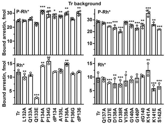 The Tr background was successfully used recently to quantify the effects of various mutations on the arrestin-1 binding to unphosphorylated light-activated rhodopsin, which in the case of WT protein is too low to allow reliable comparisons [,]. For the sake of comprehensiveness, we determined the binding of all mutants on the Tr background to both P-Rh* and Rh*. Numerous mutations affected the P-Rh* binding on the Tr background: seven increased, while eight reduced it (Figure 4). This is in sharp contrast to the WT background, where twelve mutations enhanced and only four reduced the P-Rh* binding (Figure 3). This difference is consistent with the idea that the middle loop serves as a binding-reducing brake: partial release of the brake on the WT background would increase the binding, whereas, on the already relaxed background of enhanced mutant, loosening of the brake would not matter as much. Thus, the direct effects of mutations on the interaction with rhodopsin would come to the fore. On the Tr background, the most detrimental were D138R and S142A that reduced the P-Rh* binding by 24–30%, suggesting the involvement of the mutated residues in the arrestin-1 interaction with P-Rh*. The deletion of Pro136, as well as P134A and K141A mutations, increased the binding by 21–30%, suggesting that the native residues in these positions suppress the binding even in the context of the relaxed Tr mutant. Thus, the data on Tr background do not allow us to judge whether these residues play a direct role in rhodopsin interaction. The Rh* binding on the Tr background was also sensitive to middle loop mutations. D138A, D138R, and K141E decreased it by 21–41%, while Q133E was even more detrimental, decreasing the Rh* binding by more than 80% (Figure 4). These effects are consistent with the direct involvement of the mutated residues in the interaction of the Tr form of arrestin-1 with rhodopsin. Several mutations increased the Tr binding to Rh* by 20–35%: P134G, P134A, and K141A (Figure 4), indicating that proline in position 134 and lysine-141 act as the Rh* binding suppressors even on the background of the conformationally relaxed Tr mutant. Several mutations changed the P-Rh* and Rh* binding in the same direction: P134G, P134A, and K141A increased, whereas Q137E, D138A, D138R, and S142A decreased both. The most parsimonious interpretation of binding decreases is the direct participation of native residues in the interaction. Other mutations differentially affected the binding to these two forms of rhodopsin: the deletion of Pro136 increased only the P-Rh* binding, whereas the deletion of Gly140 and its substitution by proline decreased only the binding to P-Rh*. Differential effects of the same mutation on the binding to P-Rh* and Rh* likely suggest that the Tr mutant of arrestin-1 does not engage these two forms of rhodopsin in exactly the same manner. As both mutations were deletions of residues breaking the secondary structure of the middle loop, these results suggest that the WT shape of the loop is more important for the binding to the preferred arrestin-1 target, P-Rh*. K141E only slightly reduced the P-Rh* binding while suppressing the Rh* binding by more than 40% (Figure 4). The structural interpretation of this difference is not obvious. A lysine in this position was strictly conserved in all arrestin proteins for hundreds of millions of years of evolution [], even though Lys- > Glu change would involve just one base substitution (AAG- > GAG or AAA- > GAA). This conservation suggests that the lysine in this position is functionally important. As a less drastic K141A mutation increased the binding to both forms of rhodopsin, it appears that this lysine acts as a strong binding suppressor.