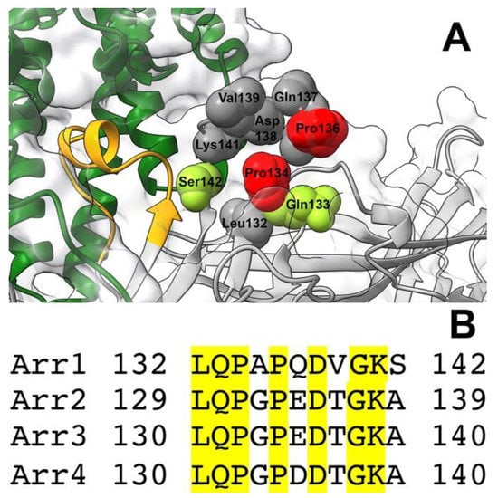 Middle loop in arrestin family members. (A) The structure of the middle loop in rhodopsin-bound arrestin-1 (complex A, PDB ID: 5w0p []). Arrestin (gray) and rhodopsin (dark green) are shown as ribbons with molecular surfaces indicated. The finger loop of arrestin-1 is shown in orange (arrow indicates N-to-C direction). Middle loop residues are shown as CPK models; two prolines in WT arrestin-1 that appear to suppress binding are shown in red; two residues important for binding (as the mutations of these residues reduce the binding on all backgrounds) are shown in light green; all other residues are shown in gray. Side chains are labeled with bovine arrestin-1 residue numbers (mouse arrestin-1 used in the structure has an identical middle loop, with the residue numbers N + 1, as compared to bovine protein). The image was created in DS ViewerPro 6.0 (Dassault Systèmes, San Diego, CA, USA). (B) The alignment of the sequences of middle loops of bovine arrestin-1, -2, -3, and -4. The numbers of the first and the last residue are indicated. Identical residues are shaded yellow.