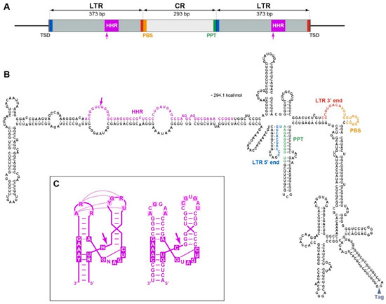 Although retrozymes from different plant species have only moderate sequence similarity, in all cases they are delimited by four-base target-site duplications and display a similar sequence organization, including two flanking LTRs of approx. 300–400 bp with embedded ribozymes and a unique central region, which is flanked by the primer-binding site (PBS) complementary to the tRNA-Met 3′-terminal sequence and a polypurine tract (PPT) [17]. The RNA transcribed from retrozyme genomic loci undergoes self-cleavage by LTR ribozymes and circularization of the resulting monomeric retrozyme RNA. The PBS and PPT sequences are necessary for priming reverse transcription on the template of retrozyme RNA and the formation of double-stranded DNA during retrozyme mobilization for transposition, which may occur in the presence of a helper autonomous retrotransposon of the Ty3-gypsy family [17]. In addition to being a template for reverse transcription, retrozyme RNA has been suggested to undergo RNA-to-RNA replication, as concluded from the presence of both (+) and (−) strands of retrozyme RNA in plants [17,18].