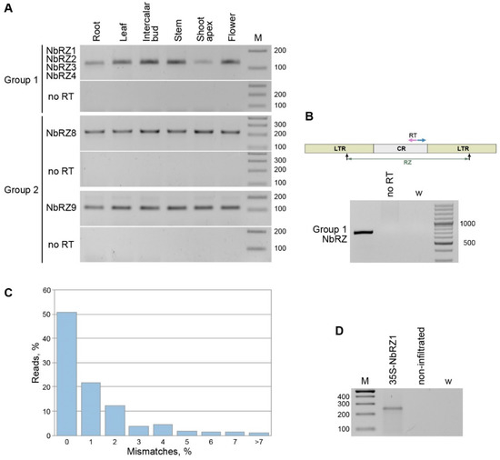 Analysis of retrozyme RNA in N. benthamiana plants. (A) Detection of retrozymes RNA in different plant parts, which are indicated above the gel. The specificity of the primers used and the retrozyme groups analyzed are indicated on the left. M—DNA size markers. (B) Percentage of retrozyme-specific reads with different numbers of mismatches with the closest genomic sequences. (C) Detection of full-length circular/concatemeric retrozyme RNA with a pair of divergent primers specific for Group 1 NbRZ. Positions of primers are shown by arrows on the retrozyme schematic representation above the gel. RT indicates the primer used for reverse transcription. (D) 5′-RACE analysis of NbRZ1-specific linear RNA in N. benthamiana leaves infiltrated with agrobacteria carrying the 35S-NbRZ1 construct and non-infiltrated leaves. W (water)—a control PCR without template added. M—DNA size markers.