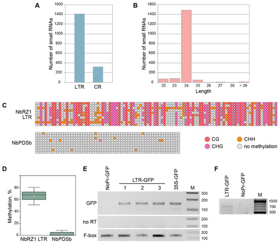 The suppression of plant gene expression is often mediated by the methylation of promoter regions [33,34]. As the NbRZ1 LTR was found to be extensively methylated, we further analyzed whether the LTR region could contain a promoter able to direct the transcription of the NbRZ1 genomic locus. Therefore, we used a 35S-GFP construct in which the green fluorescent protein (GFP) gene was cloned under the control of the Cauliflower mosaic virus 35S promoter to replace the promoter region with the NbRZ1 LTR sequence. As a negative control, a 35S-GFP construct with a deleted 35S promoter region (NoPr-GFP) was generated. A reverse transcription-PCR analysis of the N. benthamiana leaves infiltrated with agrobacteria carrying the constructs LTR-GFP, 35-GFP, and NoPr-GFP revealed the presence of a GFP transcript directed by the NbRZ1 LTR (Figure 3E), suggesting that the LTR region had promoter activity. To characterize the LTR-directed transcript, 5′-RACE with GFP-specific primers was carried out on the RNA isolated from N. benthamiana leaves infiltrated with agrobacteria carrying the LTR-GFP construct. As expected, an amplification product was found for the LTR-GFP sample but not for the NoPr-GFP sample (Figure 3F). The cloning and sequencing of the LTR-GFP-derived product revealed that the 5′-terminus of the corresponding RNA mapped exactly to the 5′-guanosine residue of the RNA generated upon the ribozyme self-cleavage of the LTR RNA (Supplementary Figure S7). Thus, the transcription of LTR-GFP is initiated at a site upstream of the LTR-embedded ribozyme sequence, and then the primary transcript is self-cleaved to give rise to the RNA identified by the 5′-RACE analysis. As the self-cleaved RNA apparently lacked a 5′-cap structure, it could not be translated, that is in agreement with the absence of either GFP fluorescence in the agroinfiltrated leaves. Thus, due to the promoter activity of the LTR region and the location of the transcription start upstream of the ribozyme sequence, the full-length N. benthamiana retrozyme loci with two LTRs are self-sufficient for generating circularization-ready, unit-length retrozyme RNA. However, according to a small RNA analysis and the results of the LTR bisulfite sequencing, the LTR-driven transcription of retrozyme genomic loci can be considerably suppressed by the methylation of the LTR region mediated by the 24-nucleotide RNAs derived from retrozyme RNA.