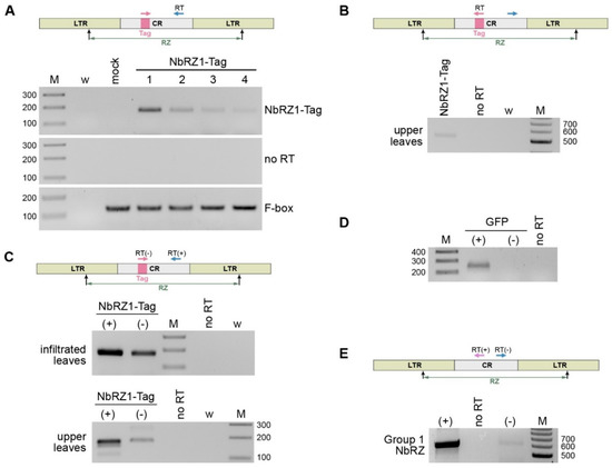 Detection of NbRZ1–NbRZ4, NbRZ8, and NbRZ9 in different parts of N. benthamiana plants, as well as detection of GFP and NbRZ1-Tag RNA in agroinfiltrated plants, was carried out by reverse transcription-PCR with specific primers (Supplementary Table S4). As an input control, mRNA of F-box protein, which is ubiquitously expressed in N. benthamiana and used as a reference gene [44], was detected by reverse transcription-PCR with specific primers (Supplementary Table S4). Total RNA was extracted from plants using TRIzol reagent according to manufacturer’s instructions (ThermoFisher Scientific, Waltham, MA, USA) and treated with RNase-free DNAse I (ThermoFisher Scientific). For detection of retrozyme-specific RNA, to ensure reliable reverse transcription of highly structured templates, the reaction was carried out at 53 °C using RevertAid H Minus reverse transcriptase (ThermoFisher Scientific). Prior to reverse transcription, RNA was incubated at 85 °C for 5 min. Amplification was carried out with the high-fidelity Encyclo polymerase possessing proofreading activity (Evrogen, Moscow, Russia).