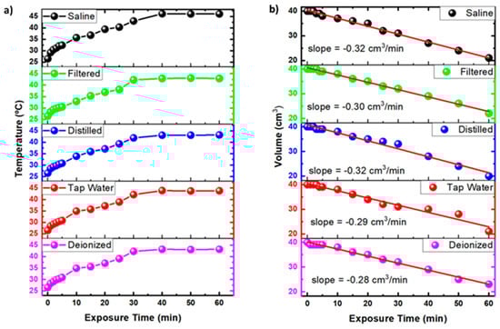Treated liquid temperature (a) and liquid volume variation (b) as a functions of exposure time to non-thermal atmospheric pressure plasma (NTAPP) for saline solution, filtered water, distilled water, tap water, and deionized water.