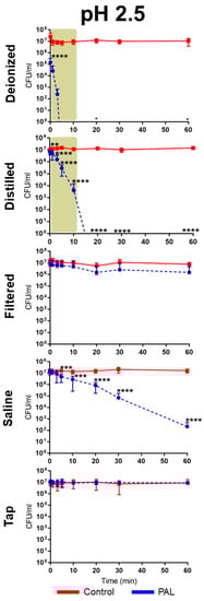 Overview of the antibacterial effects of Escherichia coli exposure in contact with different plasma-activated liquids over time at pH 2.5. The brown patterned area in graphic shows antimicrobial effect of E. coli at a short exposure time. (* p < 0.05; ** p < 0.01; *** p < 0.001; **** p < 0.0001 indicate statistical difference to untreated control group.)