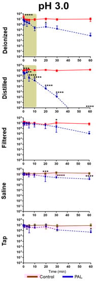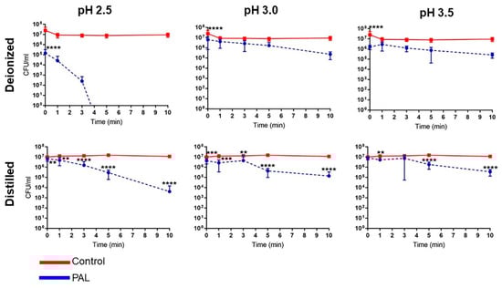 The antibacterial activity of PALs with different pHs (2.5, 3.0 and 3.5) against E. coli is shown in Figure 2, Figure 3 and Figure 4. As can be seen, the bacterial reduction depends on the exposure time, which varies from 3.0 to 60.0 min, independent of the pH.