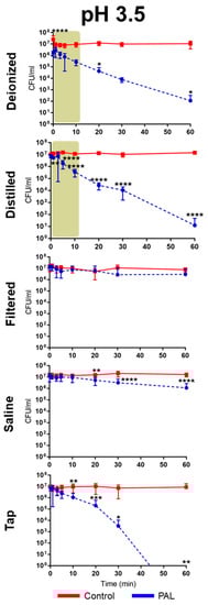 Overview of the antibacterial effects of Escherichia coli exposure in contact with different plasma-activated liquids over time at pH 3.5. The brown patterned area in graphic shows antimicrobial effect of E. coli at a short exposure time. (* p < 0.05; ** p < 0.01; *** p < 0.001; **** p < 0.0001 indicate statistical difference to untreated control group.)