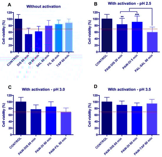 Graphics showing the percentage of viable cells obtained with MTT assay. (A) Liquids without plasma activation. (B–D) Liquids with plasma activation. The most antimicrobial liquids were evaluated in the shortest exposure time for pH = 2.5 (B), pH = 3.0 (C) and pH = 3.5 (D). The dashed line represents the normative value of cell viability (70%). (** p < 0.01; *** p < 0.001 indicate statistical differences.)