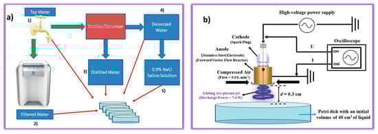 (a) Schematic illustration of the liquids used in the present work (tap water, filtered water, distilled water, deionized water, and 0.9% NaCl saline solution; (b) plasma activation experimental setup.