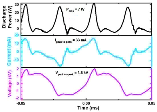 The voltage and current waveforms of the GAPJ discharge in contact with the liquids were obtained from the experimental setup (Figure 8) using a high voltage probe and a self-adjusting current probe. All of the electrical signals were recorded using a digital oscilloscope, and the current signal was obtained directly using the grounded electrode. The waveforms, voltage, electrical current, and power were unchanged for the different liquids. Figure 8 shows the discharge power, voltage, and current characteristic curves as a function of time. The electrical power that dissipated into the plasma was obtained according to []. The electrical parameters were: (i) the peak-to-peak voltage of 3.6 kV, (ii) the peak-to-peak current of 33 mA, and (iii) an electrical power that dissipated into the plasma of 7 W. The optical emission spectroscopy was carried out in our previous study [].