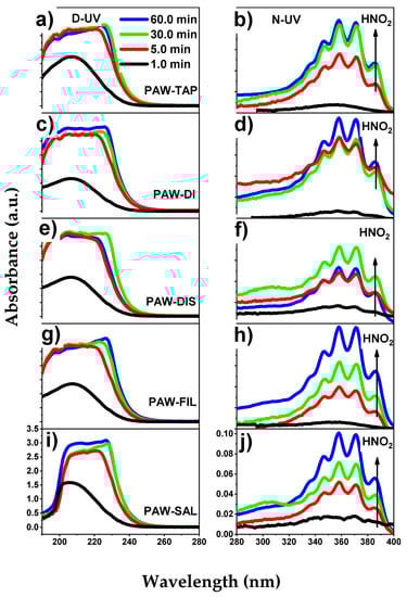 The simultaneous solution was performed for wavelengths which were defined at 230.0, 235.0, and 250.0 nm, according to []. With the aid of Equation (3), the concentration of nitrous acid (HNO2) was found because according to Tachibana et al. [], the composition of nitrous acid (HNO2) and its ion (NO2−) depends on the level of the pH in the solution with the acidity constant of HNO2 being at room temperature. As seen in the near UV (N-UV) region from 280 to 400 nm (Figure 9b,d,f,h,j), the HNO2 absorption spectra begin to appear when the pH drops dramatically. In the case of the present reactor, considerable concentrations of HNO2 are observed after 5.0 min of activation (see Table 2). This shows a direct relationship between a decreased pH and an increased in nitrous acid (as show in Equation (3)).