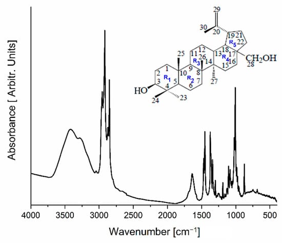 Betulin was isolated from Piptoporus betulinus according to the procedure described in Section 3.5. The amount of solid product obtained from 1 g of Piptoporus betulinus extract was 5.5 mg. The isolated white, crystalline product was examined by infrared absorption spectroscopy. The obtained experimental spectrum is presented in Figure 1 and the wavenumbers and detailed assignments of fundamental modes collected in Table 1 were compared with data presented by Falamas et al. [].