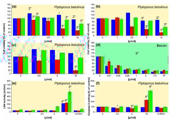 The effect of the biologically active compounds extracted from Piptoporus betulinus with the use of the different solvents on cancer cell viability has been shown previously [,,]. A549 human lung carcinoma, C6 rat glioma, and HT-29 human colon adenocarcinoma cell viability was significantly affected by Piptoporus betulinus ethyl acetate fraction in a dose–response manner, as was shown by MTT assay [].