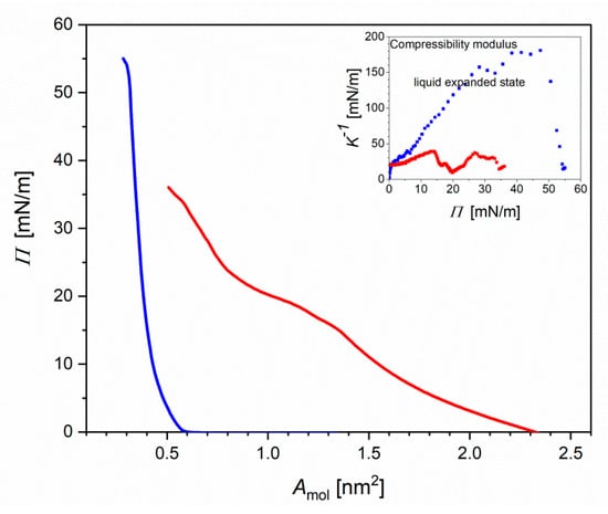 Surface pressure Π versus area per molecule (Amol) isotherms of the DMPC:GD1a:chol (5:2:3) lipid monolayer on the aqueous (blue) and 1% aq. Piptoporus betulinus extract after 30 min of incubation (red). Inset: Compressibility modulus versus Π of the lipid monolayer on the aqueous (blue) and 1% vol Piptoporus betulinus ethanolic extract in water after 30 min of incubation (red).