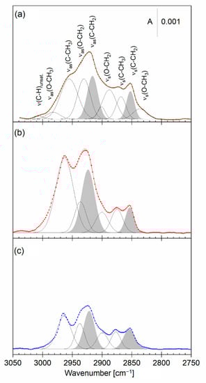 The hydrocarbon chains in DMPC and GD1a lipids in the bilayer film give well-resolved CH stretching modes of the methylene: νas(CH2) and νs(CH2) as well as methyl: νas(CH3) and νs(CH3) groups (Figure 4c). In both the DMPC and DMPC:chol—DMPC:GD1a:chol bilayers, the νas(CH2) was centered at 2922 cm−1 while the νs(CH2) was at 2852 cm−1, indicating that the hydrocarbon chains exist in a liquid phase. No change in the position of these modes was observed upon the interaction with the extract. In the spectrum of the DMPC bilayer, no IR absorption modes originating from the methyl and methylene groups attached to the O atoms were present. In the DMPC:chol—DMPC:GD1a:chol bilayer, these modes did not change and their positions did not overlap with the modes characteristic for the extract. It indicates that the molecules in the extract containing a significant amount of these groups (e.g., carbohydrates) do not intercalate into the bilayer.