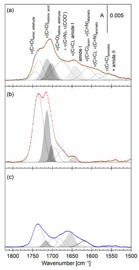 The low-frequency spectral region provides information about the polar functional groups present both in lipids and Piptoporus betulinus extract (Figure 5). The dried Piptoporus betulinus extract shows many overlapped absorption bands in this spectral region (Figure 5a and Figure S5, and Table S3).