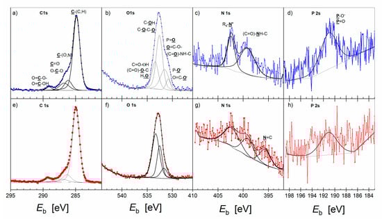 High-resolution C 1s (a,e), O 1s (b,f), N 1s (c,g) and P 2s (d,h) XP spectra of the asymmetric DMPC:chol—DMPC:GD1a:chol bilayer on the Au surface transferred from aqueous (a–d; blue) and 1% vol Piptoporus betulinus extract aqueous subphase (e–h; red). Assignment to each element to different chemical environments is given in each figure.