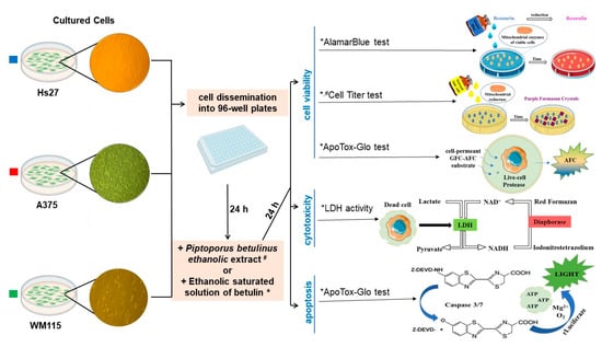 Scheme of in vitro cell-based assays used to determine Hs27, A375, and WM115 cell viability, cytotoxicity, and apoptosis in the presence of Piptoporus betulinus extact (tests marked in the figure with a hash mark (#)), and cell viability in the presence of betulin solution (tests marked in the figure with an asterisk (*)), and their principles.