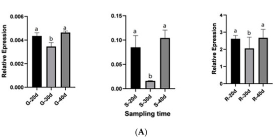 Relative expression levels of UFGT1 and UFGT2 genes in the same cultivars at different periods. (A) Relative expression of UFGT1 in different cultivars. (B) Relative expression of UFGT2 in different cultivars. Bars marked with the same and different letters indicate non-significant and significant differences, respectively. The significance level is α = 0.05. R, FZ-72 (red calyx); G, Baitao K (green calyx); S, MG5 (stripped calyx).