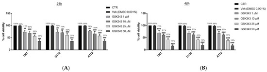 Effect of GSK343 treatment on human GB cell viability. MTT assay revealed that the treatment with GSK343 at the concentrations of 1, 10, 25 and 50 μM significantly reduced viability in U87, U138, and A172 cell lines, in a concentration-dependent manner both at 24 h (A) and 48 h (B) compared to the control group. Data are representative of at least three independent experiments. (A) ## p < 0.01 vs. Ctr; ### p < 0.001 vs. Ctr. (B) ### p < 0.001 vs. Ctr.