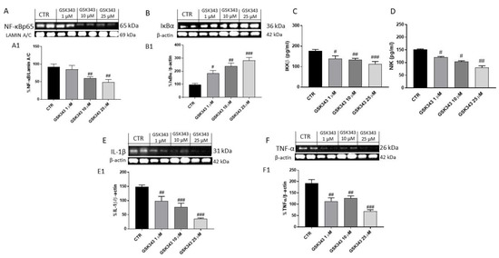 The effect of GSK343 on the NF-κB/IκBα pathway was evaluated in U87 cell lysates. Our results demonstrated that the treatment with GSK343 for 24 h at the concentrations of 10 and 25 μM was able to significantly reduce NF-κB expression and also at the lower concentration of 1 μM, restored IκB-α expression and decreased IKKβ in a concentration-dependent manner compared to the control group (Figure 2A–C). Additionally, we detected the effect of GSK343 on NF-κB-inducing kinase (NIK) level, a kinase that regulates the activation of the non-canonical NF-κB pathway, by ELISA kit, demonstrating that GSK343 treatment for 24 h was able to reduce its level (Figure 2D). Moreover, we decided to investigate the effect of GSK343 on pro-inflammatory cytokines expression such as IL-1β and TNF-α by Western blot analysis, showing that GSK343 treatment for 24 h at the concentrations of 1, 10 and 25 μM significantly decreased their expression compared to control group (Figure 2E,F).