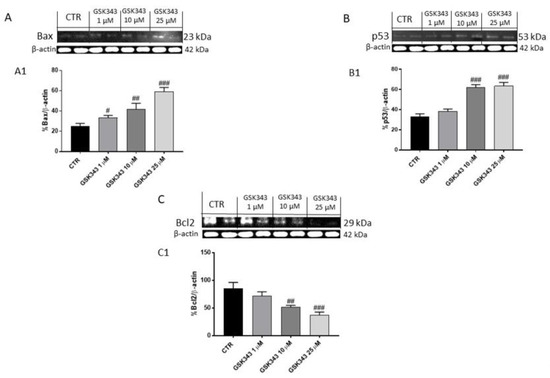 The effect of GSK343 on the apoptotic pathway was investigated in U87 cell lysates. After 24 h of treatment, our data demonstrated that GSK343 at the concentrations of 1, 10 and 25 μM was able to increase the expression of pro-apoptotic protein as Bax, while p53 expression was notably increased only at the concentrations of 10 and 25 μM (Figure 3A,B); instead, anti-apoptotic Bcl2 protein expression was significantly reduced at 10 and 25 μM concentrations, as shown in Figure 3C.