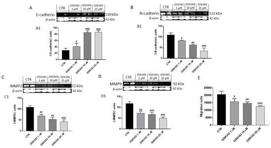Considering the involvement of EZH2 in epithelial–mesenchymal transition (EMT) [34], we decided to investigate the effect of GSK343 treatment on E-cadherin and N-cadherin protein levels by Western blot analysis. Our data demonstrated that the treatment with GSK343 for 24 h at the concentrations of 1, 10 and 25 μM was able to increase E-cadherin expression and reduce N-cadherin expression (Figure 4A,B).