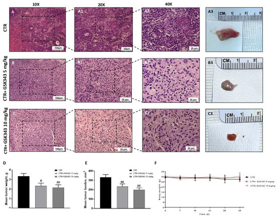 Effect of GSK343 treatment on tumor growth. Elevated nuclear pleomorphism was observed in the control group (A,A1,A2); however, GSK343 at doses of 5 mg/kg and 10 mg/kg significantly reduced it (B,B1,B2,C,C1,C2). The panels D and E showed a reduction in tumor weight and tumor burden, respectively, following GSK343 treatment at doses of 5 mg/kg and 10 mg/kg without encountering important weight differences (F). Sections were observed and photographed at 10×, 20× and 40× magnifications. Data are representative of at least three independent experiments. (D) # p < 0.05 vs. Ctr; ## p < 0.01 vs. Ctr; (E) ## p < 0.01 vs. Ctr.