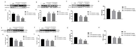 Based on the in vitro results, we evaluated the effect of GSK343 treatment on canonical and non-canonical NF-κB/IκBα pathways also in the U87-xenograft model. Our results demonstrated that the control group was characterized by an increase in nuclear NF-κB expression and a decrease in cytosolic IκBα expression (Figure 6A,B). Moreover, the GB group demonstrated a significant increase in IKKβ expression (Figure 6C); however, the treatment with GSK343 at both doses was able to reduce NF-κB translocation into the nucleus and restore IκB-α cytosolic expression compared to the control group (Figure 6A,B), also reducing IKKβ expression (Figure 6C). Additionally, to prove that GSK343 was able to modulate non-canonical NF-κB/IκBα pathway activation, we also investigated NIK level by ELISA kit, demonstrating that the treatment with GSK343 at doses of 5 mg/kg and 10 mg/kg significantly decreased its level (Figure 6D). Our data on the NF-κB/IκBα pathway were also confirmed by evaluating phosphorylated proteins p-NF-κB and p-IκB-α by Western blot analysis (Figure 6E,F). Moreover, we decided to evaluate the effect of GSK343 treatment also on pro-inflammatory cytokines levels as IL-1β and TNF-α by ELISA kit, demonstrating that the control group was characterized by high levels of IL-1β and TNF-α; however, the treatment with GSK343 at doses of 5 mg/kg and 10 mg/kg significantly reduced their levels (Figure 6G,H).