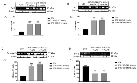 Effect of GSK343 on apoptosis process in the U87-xenograft model. The blots revealed that the treatments with GSK343 at doses of 5 mg/kg and 10 mg/kg significantly increased pro-apoptotic protein Bax, BID and caspase-9 expression (A–C), whereas Bcl2 expression was reduced following GSK343 treatment compared to control group (D). Data are representative of at least three independent experiments. (A) ### p < 0.001 vs. Ctr; (B) ### p < 0.001 vs. Ctr; (C) ### p < 0.001 vs. Ctr; (D) ### p < 0.001 vs. Ctr.