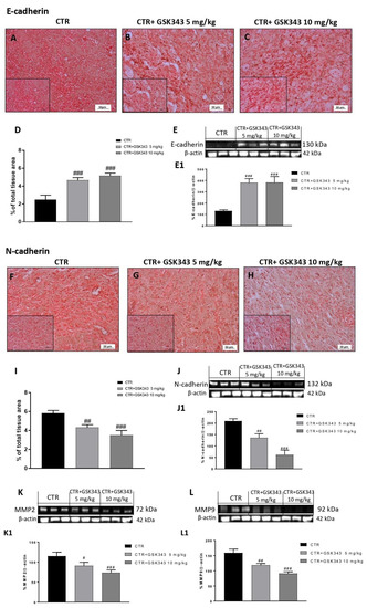 Immunohistochemical localization was performed, as previously described [59]. Slides were incubated overnight (O/N) using the following primary antibodies: anti-E-cadherin (Santa Cruz Biotechnology, Dallas, TX, USA; 1:100 in PBS, v/v; sc-8426) and anti-N-cadherin (1:100; Santa Cruz Biotechnology, Dallas, TX, USA; sc-8424). At the end of the incubation with the primary antibodies, the sections were washed with PBS and incubated with a secondary antibody (Santa Cruz Biotechnology, Dallas, TX, USA) for 1 h at room temperature. The reaction was revealed by a chromogenic substrate (brown DAB), and counterstaining with nuclear fast-red. Immunohistochemical images were obtained and observed using a Zeiss microscope with Axio Vision software. The percentage area of immunoreactivity (brown staining, determined by the number of positive cells) is expressed as % of the total tissue area (red staining) of five random fields with objective lens at 20 × (50 μm of the bar scale) and 40× (20 μm of the bar scale); the analysis was performed using ImageJ.