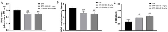Effect of GSK343 on oxidative stress in U87-xenograft model. GSK343 5 mg/kg and 10 mg/kg decreased ROS, MDA, and increased SOD levels compared to the control group (A–C). Data are representative of at least three independent experiments. (A) ## p < 0.01 vs. Ctr; (B) ## p < 0.01 vs. Ctr; (C) # p < 0.05 vs. Ctr; ## p < 0.01 vs. Ctr.