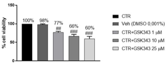 GSK343 cytotoxicity was evaluated in primary GB cell culture obtained from patients, demonstrating that GSK343 treatment for 24 h at the concentrations of 1, 10 and 25 μM was able to significantly reduce primary GB cells viability compared to the control group, confirming its antiproliferative effect (Figure 10).