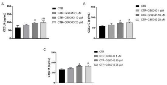 ELISA assay revealed that GSK343 treatment (10 and 25 μM) increased CXCL9, CXCL10 and CXCL11 levels (A–C) compared to the control group. No significance was revealed for the treatment 1 μM. Data are representative of at least three independent experiments. (A) # p < 0.05 vs. Ctr; ## p < 0.01 vs. Ctr; (B) # p < 0.05 vs. Ctr; (C) # p < 0.05 vs. Ctr.