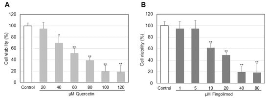 Viability of HepG2 cells treated for 24 h with quercetin in a concentration range of 20–120 μM (A) and fingolimod (B) in a concentration range of 1–80 μM. Statistical significance is presented as comparison of treated cells with controls. * p< 0.05; ** p< 0.001.